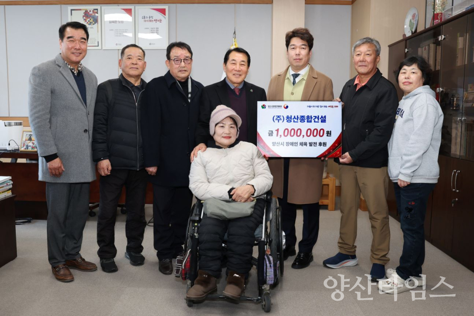 양산시장애인체육회(회장 나동연)는 ㈜청산종합건설이 장애인 체육 발전을 위해 100만원을 기탁했다고 밝혔다.