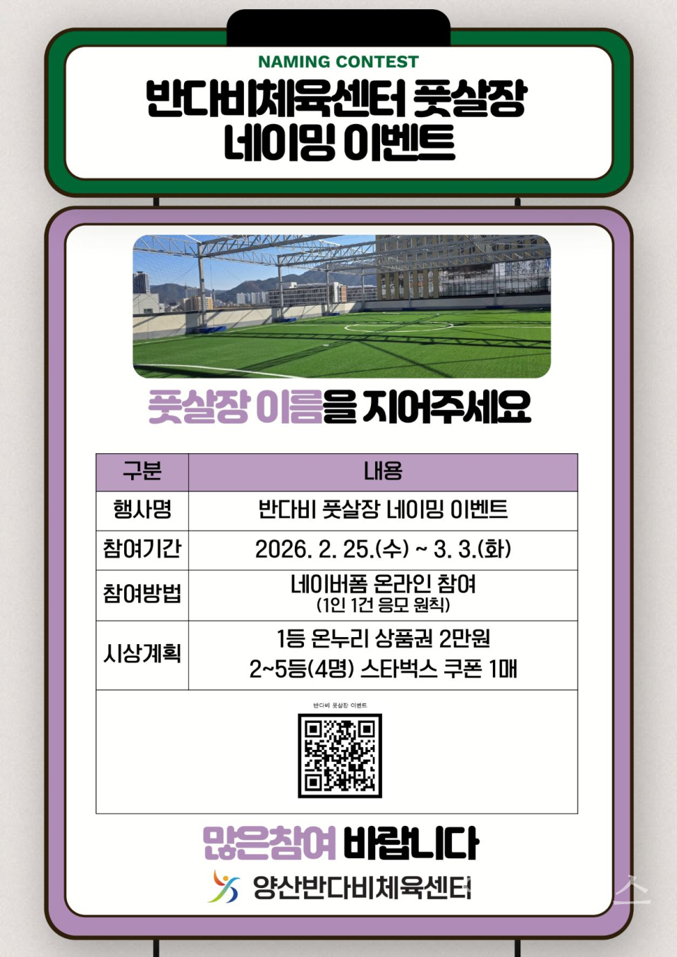 양산시시설관리공단(이사장 박성관) 반다비체육센터는 지난 1월 조성을 완료한 루프탑 풋살장의 공식 명칭 선정을 위해 ‘풋살장 네이밍 이벤트’를 실시한다고 밝혔다.