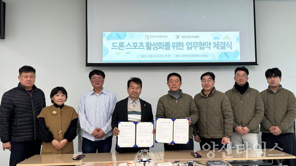 양산시시설관리공단(이사장 박성관)은 지난 25일 양산드론스포츠협회(회장 신경진)와 드론스포츠 활성화를 위한 업무협약(MOU)을 체결했다고 밝혔다.